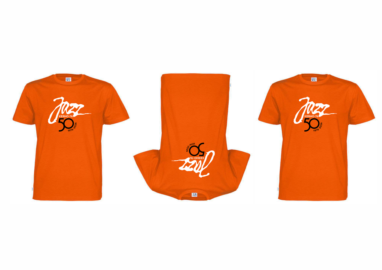 Jazzkerho -76 50v juhlavuoden oranssin värinen t-paita saatavana juhlakonsertin ja muiden tulevien keikkojen yhteydessä hintaan 25€/kpl.